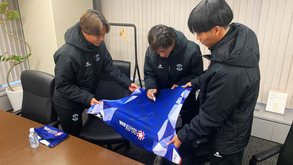 2026年1月23日、当社がユニフォームパートナーを務めるサッカークラブ「奈良クラブ」の生駒 稀生選手、森田 凜選手、望月 想空選手が表敬訪問のためご来社されました。